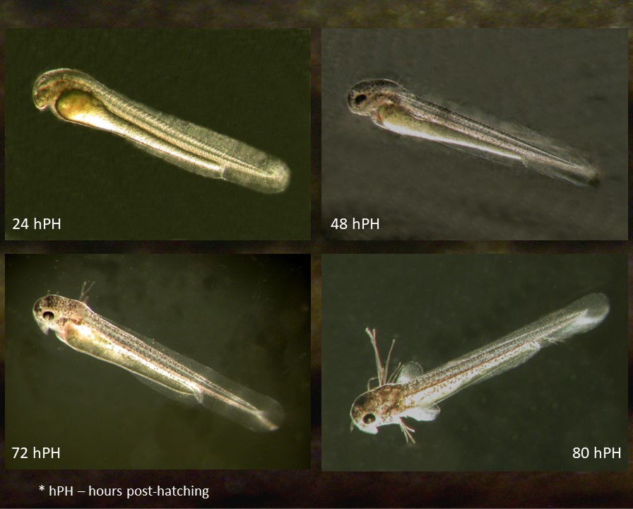 144 hPH – FIRST FEEDING – Further growth in body length, the external gills have almost totally disappeared